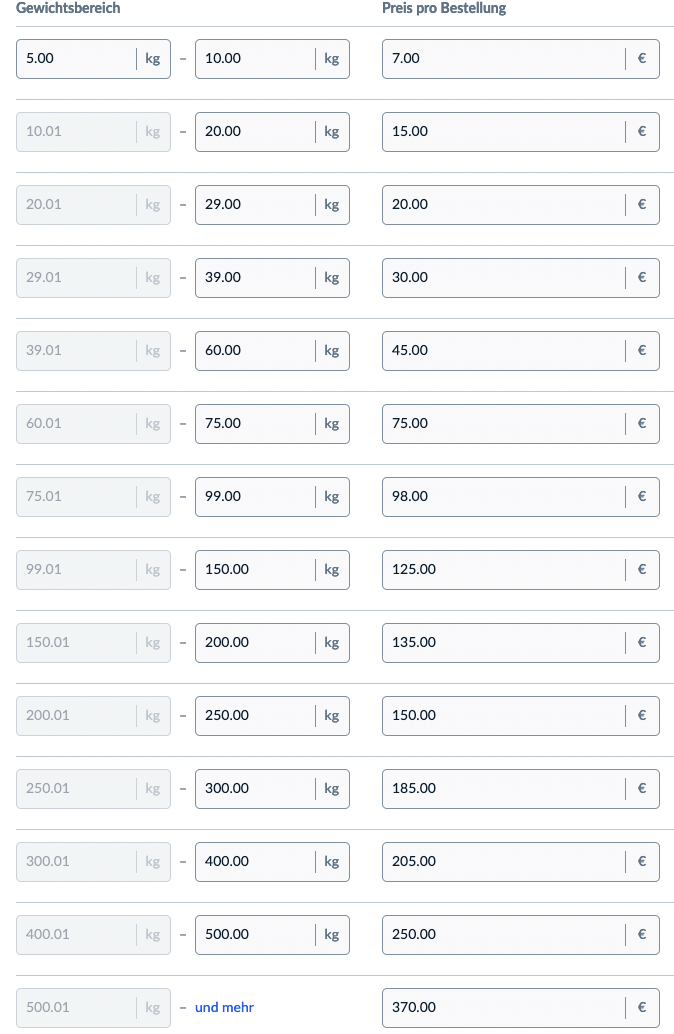 Wir berechnen die Versandkosten nach Versandgewicht: